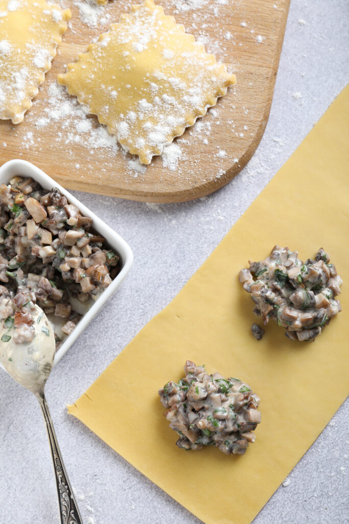 3. Extiende la pasta delgada sobre una superficie limpia y enharinada. Coloca pequeñas porciones del relleno, cubre con otra lámina de pasta y corta los ravioles.