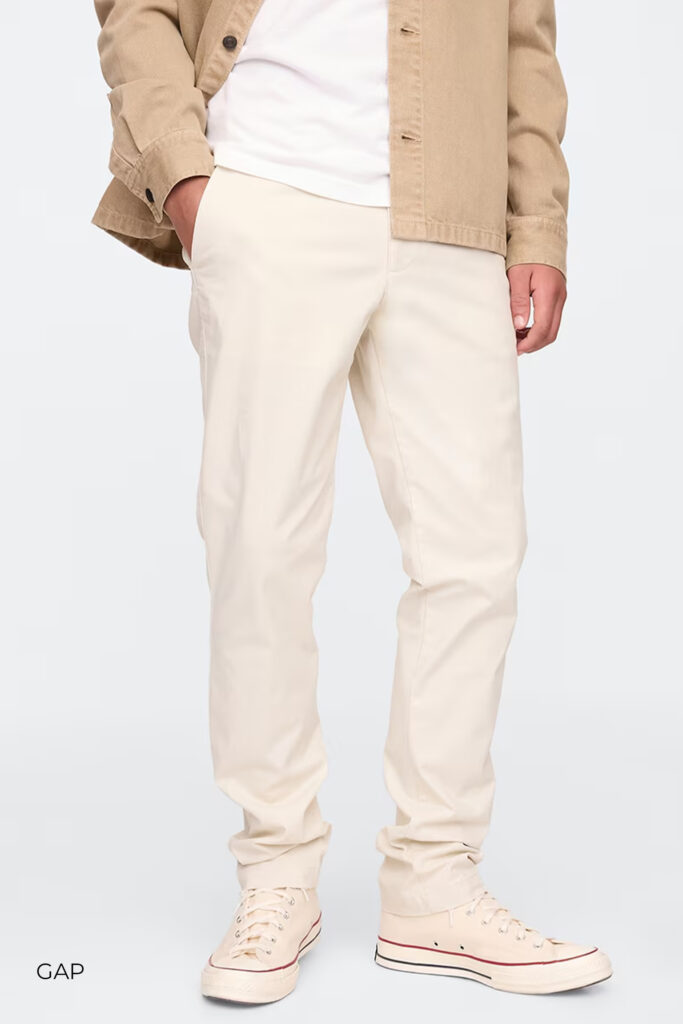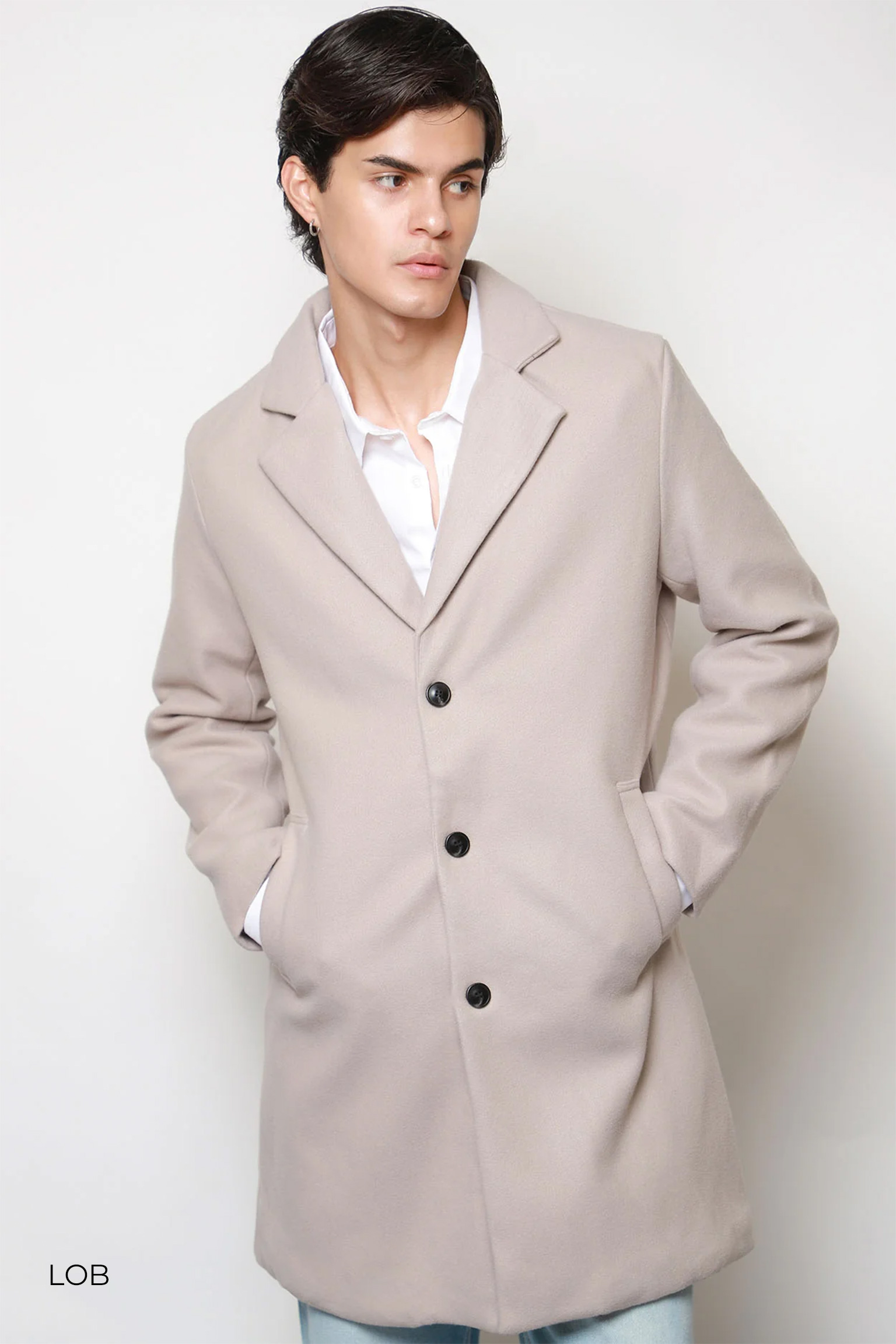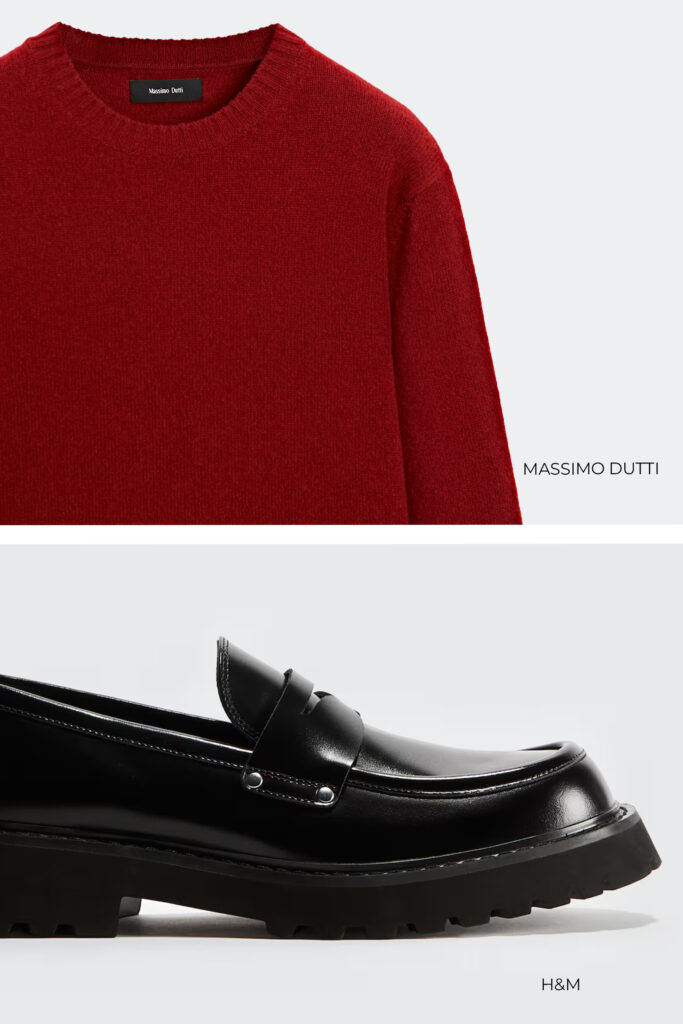 En LOB encuentras el diseño básico en tono beige con solapa clásica y botones frontales, perfecto para vestir en esta temporada de fiestas. Lleva por abajo el suéter de cuello redondo en tejido de lana color rojo oscuro de Massimo Dutti y los pantalones chinos beige de GAP. Remata con los mocasines de suela track en color negro de H&M.