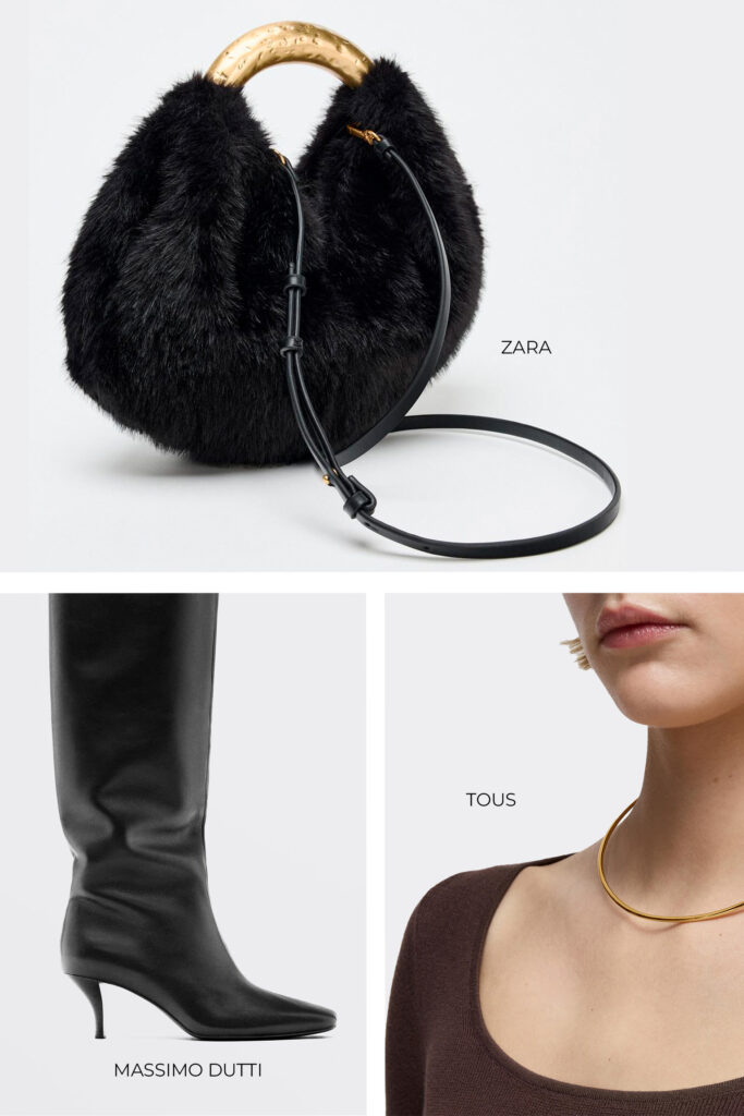 Lleva esta pieza en tus propuestas nocturnas para lucir estilosa y reducir el frío a la vez: suma el modelo oversize en tono crudo de Stradivarius con cierre frontal cruzado. Combínalo con el sensual vestido de satín mini con cuello escotado y tirantes finos tono topo de Mango. Para el calzado, usa las elegantes botas altas de piel negra con tacón fino de Massimo Dutti y remata con el bolso de mano efecto pelo negro con asa metálica de Zara y el collar minimalista en baño de oro de 18K de Tous.