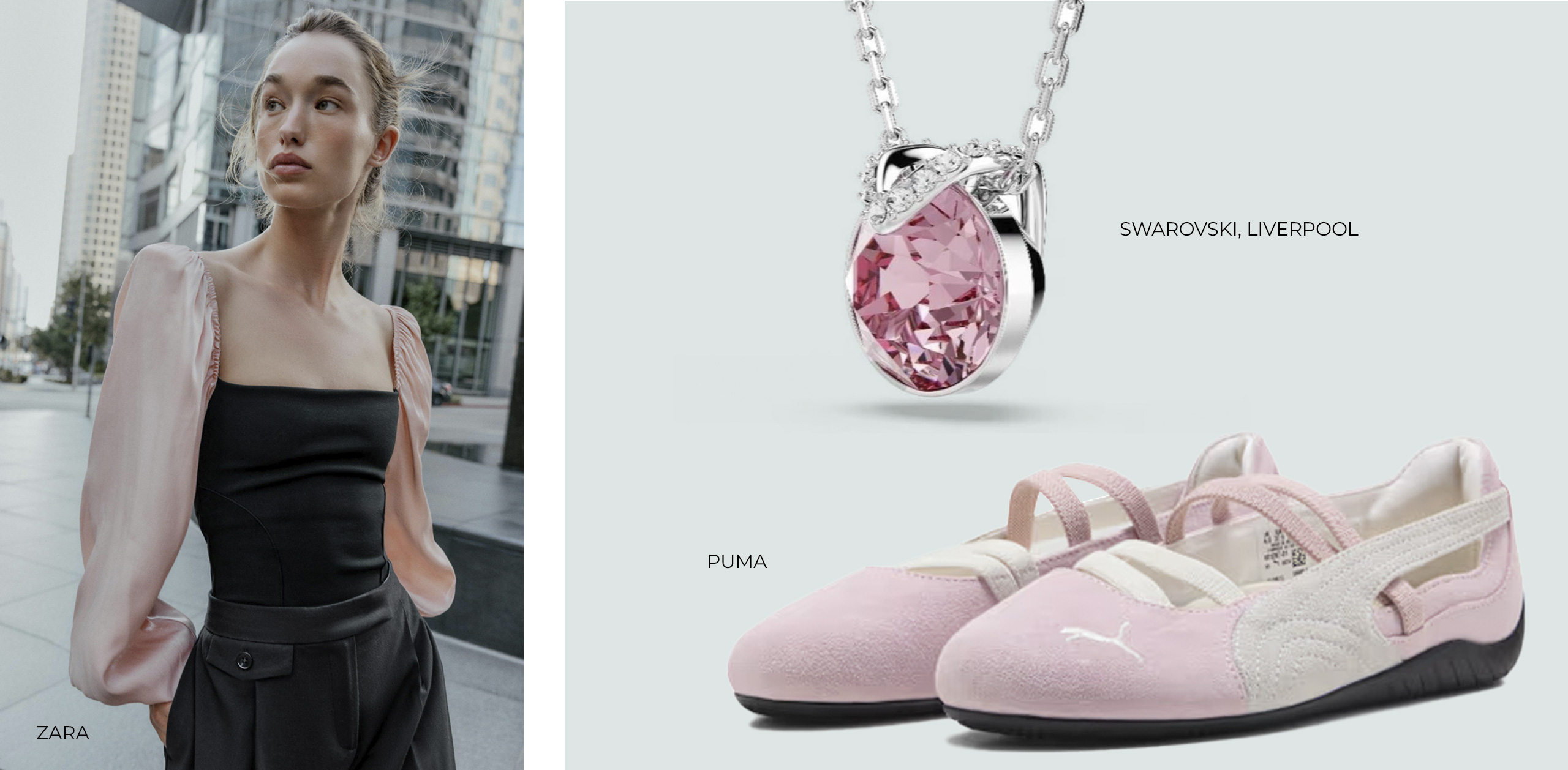 Arma un look delicado y etéreo con el body negro de escote cuadrado y manga rosa abullonada que evoca feminidad, disponible en Zara. Utiliza el pantalón ancho satinado de Massimo Dutti para generar este movimiento de fantasía a la silueta. De calzado, recomendamos utilizar el calzado en tendencia: las bailarinas speedcat que encuentras en Puma. Como accesorio, usa el collar Bella de piedra rosa de Swarovski, disponible en Liverpool.