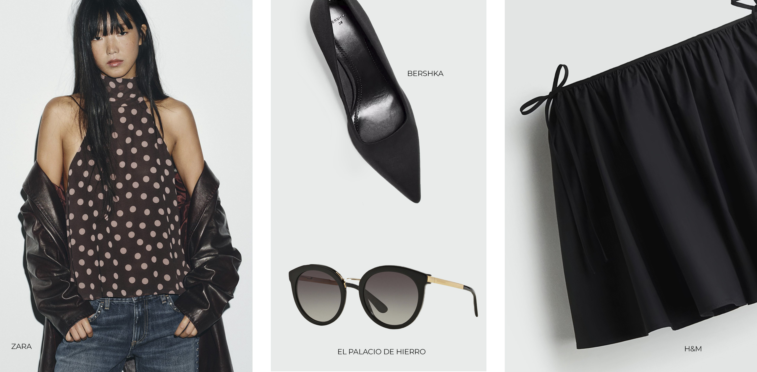 Para un outfit más clásico, utiliza el top de cuello halter con puntos rosas de Zara. Para la parte de abajo combina con la falda negra con detalles de lazos de H&M junto con las medias rosas de encaje de Oroblu, disponibles en Liverpool. Para el calzado te recomendamos usar los clásicos tacones negros de Bershka. Suma a este look los lentes oscuros de ojo de gato de Dolce & Gabbana que encuentras en El Palacio del Hierro.
