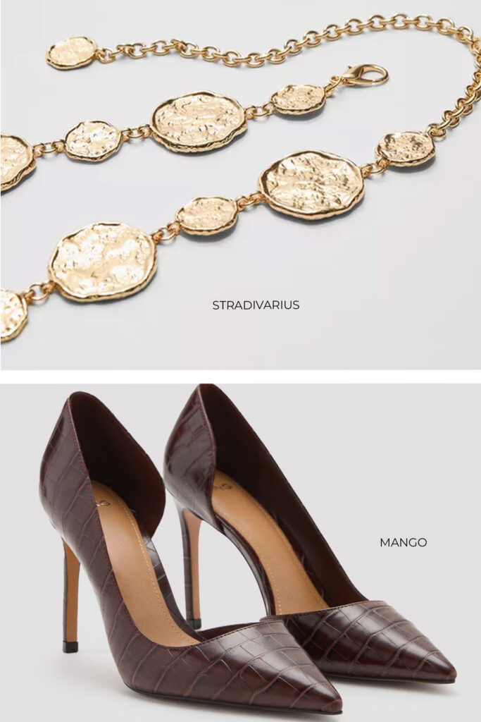 No pierdas la oportunidad de lucir unas cómodas bermudas en tus looks de oficina. Massimo Dutti tiene el modelo sastre perfecto con corte holgado y fluido en color marrón topo. Combínalo con la camisa básica en tono blanco de H&M en mezcla de tejido de lino. Dale un toque de brillo a tu outfit sumando el cinturón joya dorado con placas redondas de Stradivarius. Para el calzado, utiliza los stilettos de corte asimétrico y texturizados color chocolate de Mango.