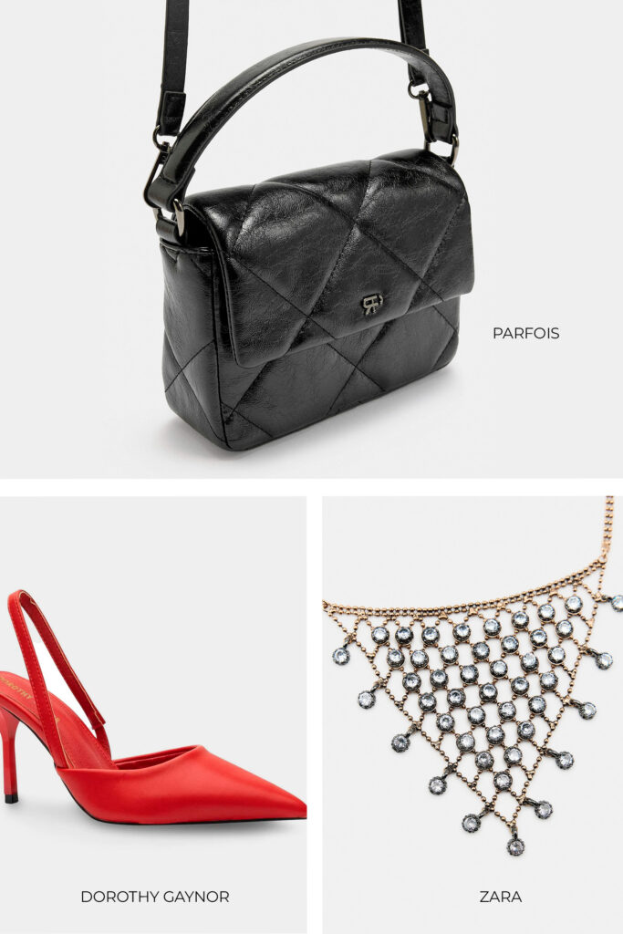 Utiliza esta apasionada combinación cromática en tus looks de San Valentín. Nuestra propuesta para una cita de día es la blusa en acabado brillante color rojo con vuelo péplum, mangas globo y escote V de H&M. Complementa con el pantalón de vestir negro flare de Mango. Para el calzado, vuelve al romántico rojo con los slingback con acabado liso y tacón fino de Dorothy Gaynor. Suma accesorios como el minibolso de mano con efecto acolchado en negro de Parfois y dale brillo a tu look con el elegante collar triangular con aplique de joyas a contraste de Zara.