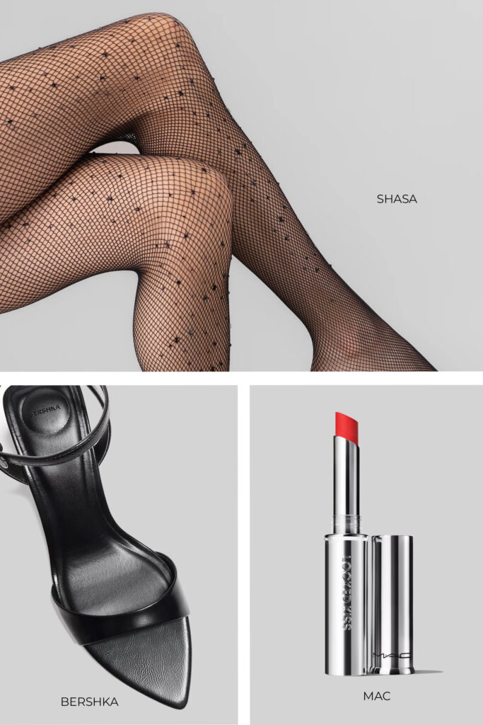 Para una cena romántica, recurre a la propuesta más clásica y elegante del armario, que es un vestido rojo como el modelo mini de Mango con detalle fruncido y escote asimétrico. Súmale unas piezas complementarias en negro para dejarle el foco al vestido como las medias de red con incrustaciones de brillos de Shasa. Para el calzado, usa la sandalia de tacón con pulsera de Bershka. No te olvides de un buen abrigo como el diseño estructurado y cruzado con detalles de peluche de Ivonne. Lleva contigo todo lo necesario en el clutch de pedrería Huser, disponible en Liverpool, y usa el pintalabios en tono ruby con acabado mate de MAC Cosmetics.