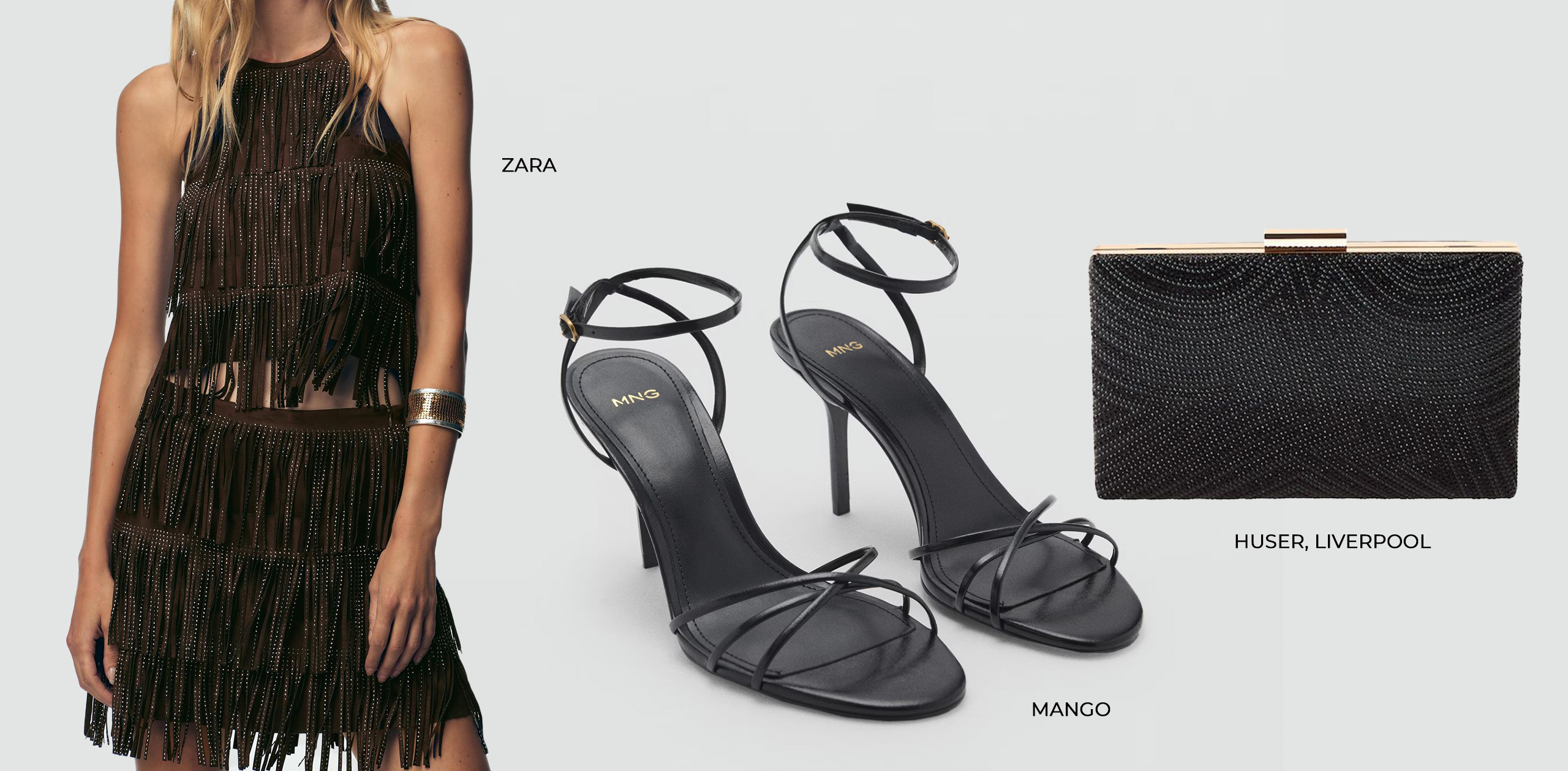 Para tener toda una vibe de estrella del espectáculo utiliza el conjunto el top y falda de flecos y brillos de Zara para resaltar. Combina con las sandalias de tacón en color negro de Mango y complementa con el bolso tipo clutch Huser, disponible en Liverpool.