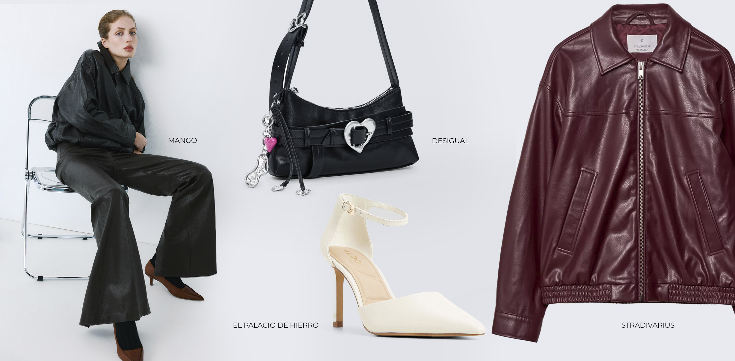 Para el calzado opta por las zapatillas slingback blancas con tacón aguja de Aldo que encuentras en El Palacio de Hierro. Añade por último el bolso negro de efecto piel con detalle romántico de Desigual.