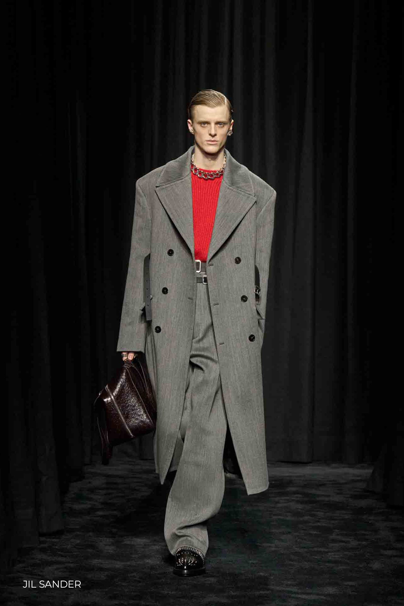 Desde un gris carbón, pasando por un topo, hasta llegar al gris aperlado, es como este sofisticado color ha confirmado su regreso en las pasarelas. En Dior Men tiñe chaquetas, tops, pantalones y accesorios como bolsos, donde su mejor aliado cromático es el negro, logrando looks elegantes. Jil Sander nos muestra, por un lado, un espectacular conjunto de cuero patchwork, pero también aparecen propuestas sastre en gris topo que complementa con jersey y calzado rojo vibrante. Por su parte, Giorgio Armani presentó una colección donde el gris y sus subtonos son protagonistas, elevando conjuntos sastre, abrigos largos clásicos, gabardinas, americanas y pantalones, donde destaca el estilo monocolor, y la combinación de este, con brillante tejido de terciopelo (verde, burdeos y azul rey).