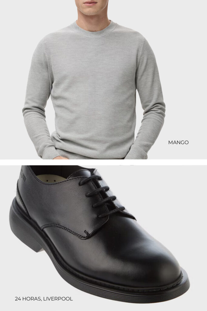 Opta por sumar a tu guardarropa prendas básicas que puedas usar en diferentes ocasiones, como el abrigo clásico en lana gris jaspe corte slim fit de H&M, perfecto para llevar a una cena complementando con su mejor aliado que es el negro, como con la camisa formal negra de C&A. Agrega encima el jersey de cuello redondo en gris claro de Mango. Para la parte baja, te sugerimos el pantalón negro straight Regent Street de Liverpool. Como calzado, el zapato derby (también negro) de 24 HORAS de Liverpool.