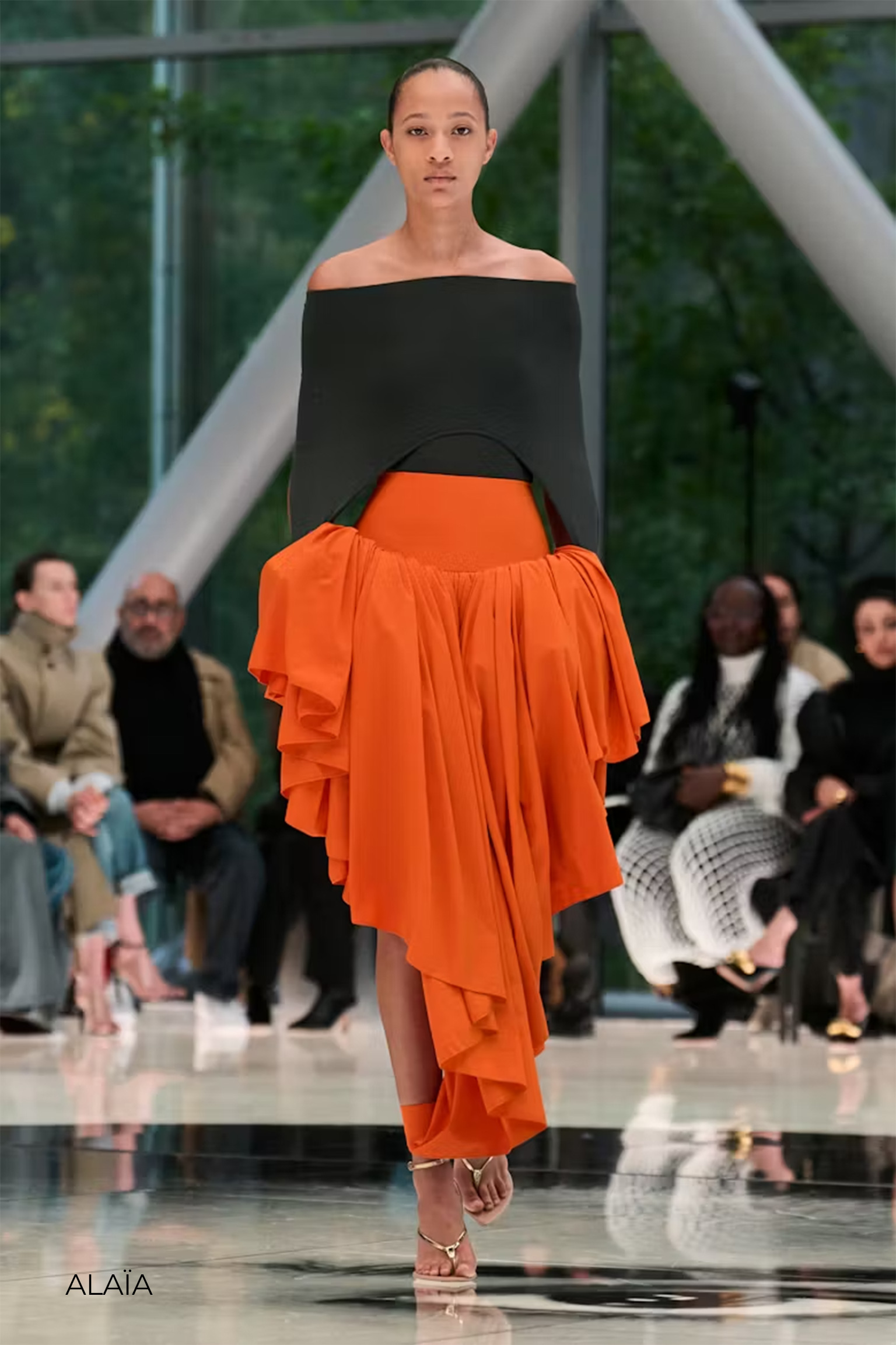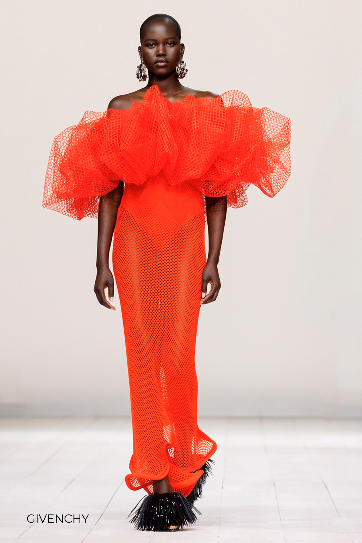 Los desfiles internacionales fueron los primeros en mostrarnos señales de su regreso, sobre todo en vestidos de fiesta como Saint Laurent, quien añade volantes a su diseño largo. Givenchy muestra un sofisticado vestido de red al que agrega grandes drapeados en su escote palabra de honor. En Zimmermann, un sastre compuesto de minishort, chaleco y americana se complementa con plataformas y un bolso café para un estilo elegante-casual. Sobre el mismo estilo, Alaïa propone una falda asimétrica en este tono que combina con top negro y sandalias de tacón metalizadas. Chanel recurre al naranja en sus renovados conjuntos de tweed transparentes.