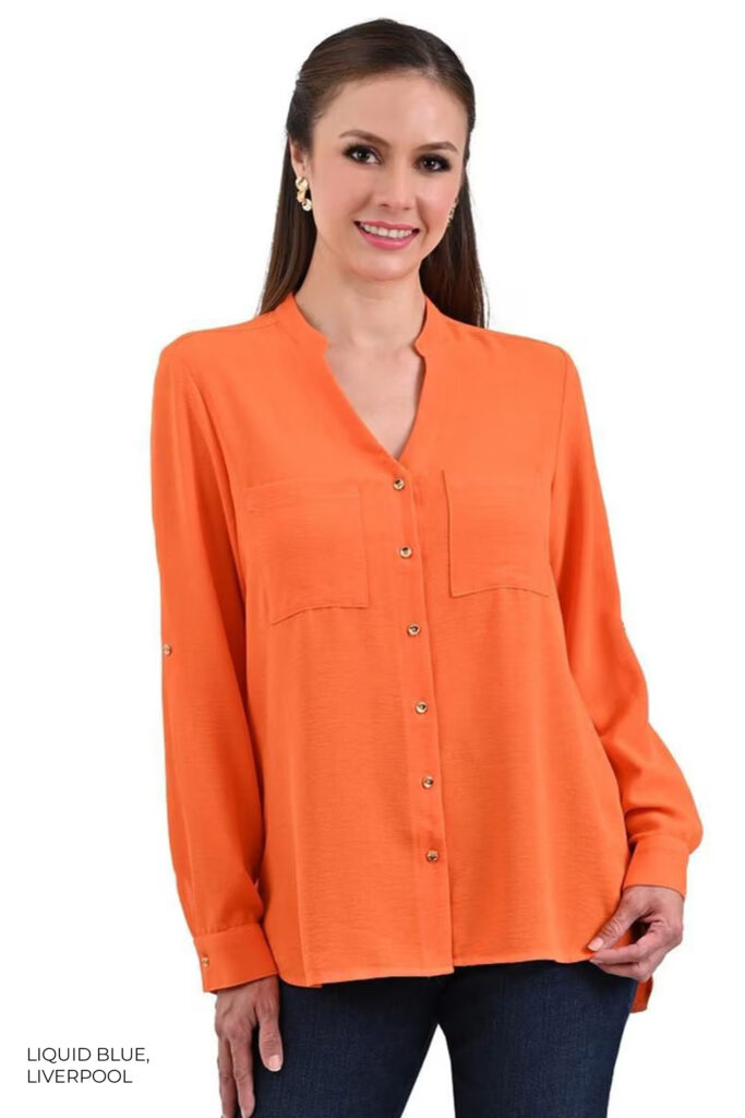 Para el día a día recurre a una camisa de manga larga naranja con bolsillos superiores Liquid Blue, disponible en Liverpool. Llévala metida sobre el pantalón ancho de vestir con pinzas en color beige de Stradivarius. Para el calzado, suma las sandalias de tiras cruzadas en tejido de ante camel de Massimo Dutti. Como accesorios, agrega el collar con abalorios de pétalos de Parfois y el bolso de efecto piel con detalle trenzado en tono naranja de Desigual.