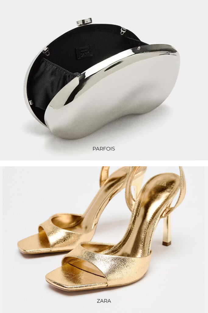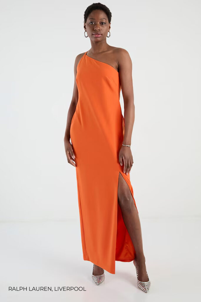 Sigue las recomendaciones de las pasarelas e incluye un vestido color naranja vibrante en tus looks de invitada como el modelo liso y largo de un hombro con abertura en la pierna de Ralph Lauren que encuentras en Liverpool. Compleméntalo para una fiesta con la sandalia de tacón efecto charol dorada de Zara. Recoge tu pelo para destacar el escote del vestido y añade los aretes largos con detalle de cuentas multicolor de H&M. Finaliza con el bolso tipo clutch dorado con asa larga oculta de Parfois.