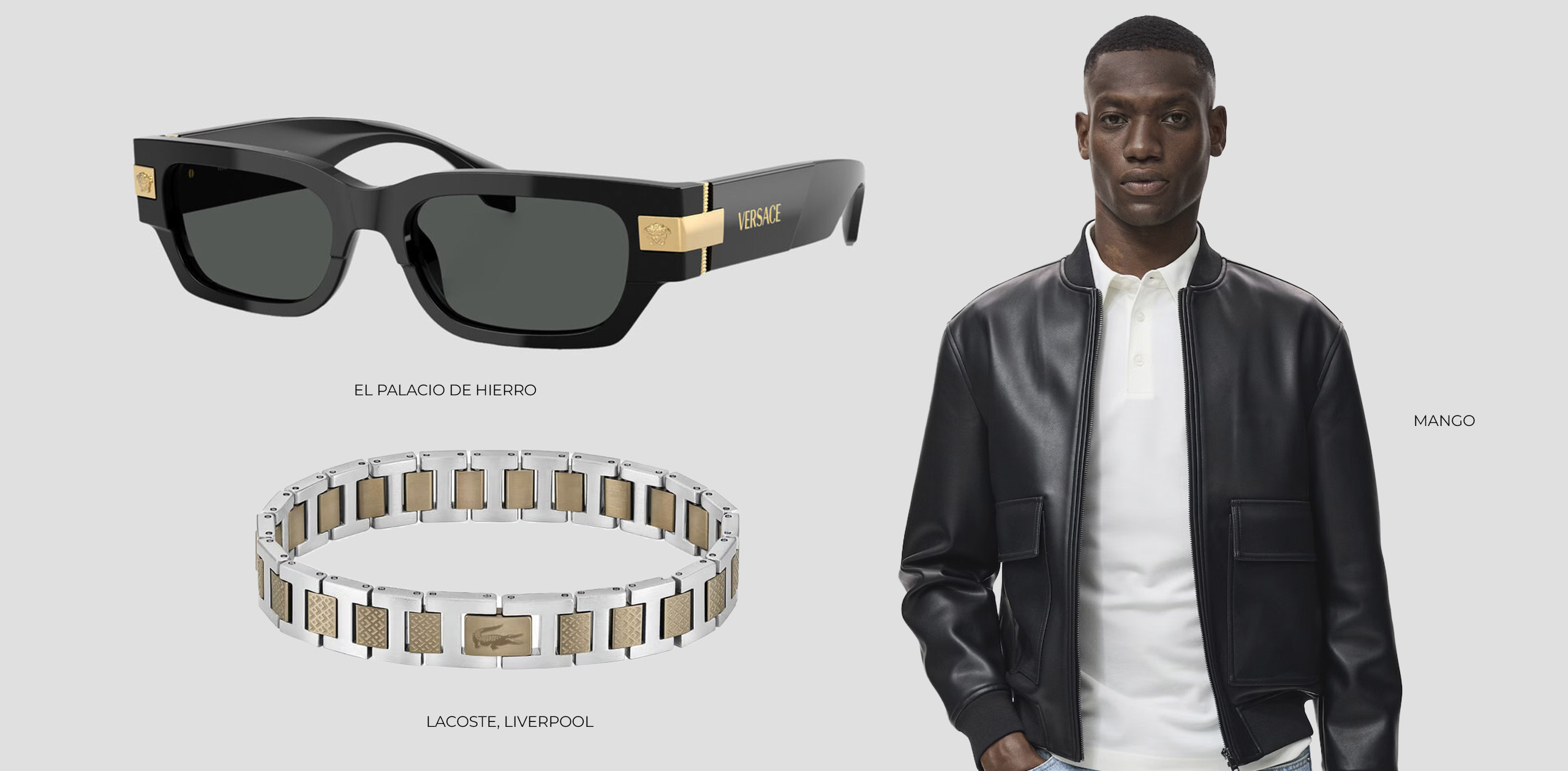 Una propuesta al estilo Hassan comienza con la cazadora de corte bomber efecto piel negra de Mango, que hace un perfecto match con cualquier outfit sofisticado. También utiliza los lentes de sol rectangulares Versace en color negro con detalles en dorado, disponibles en El Palacio de Hierro. Para no dejar el lado urbano del outfit, opta por el brazalete Lacoste de la colección Metropole con eslabones rectangulares que encuentras en Liverpool.