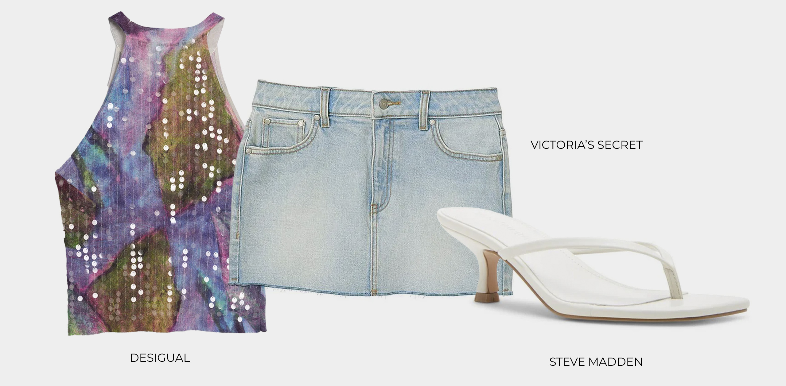 Conviértete en un atardecer con la blusa estampada de escote halter y aplicaciones de lentejuelas de Desigual en conjunto con la falda mini de mezclilla suave by Pink de Victoria’s Secret. Para el calzado utiliza las sandalias de tacón bajo de Charlenne Bone Paris de Steve Madden, ideales para la temporada de primavera y para lograr un look arreglado sin esfuerzo.