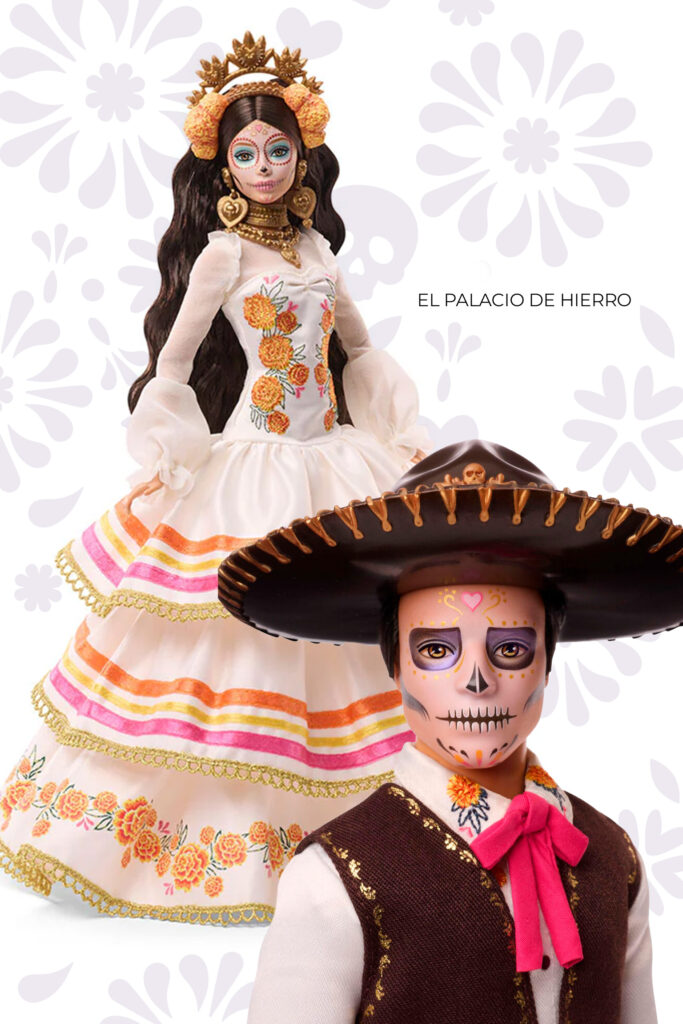 Por su parte, Ken se presenta con una camisa bordada con motivos florales de cempasúchil y un chaleco charro a juego con el pantalón. Su look se complementa con un sombrero de detalles en dorado a juego con el vestido de Barbie y por supuesto, un maquillaje de catrín tradicional.
