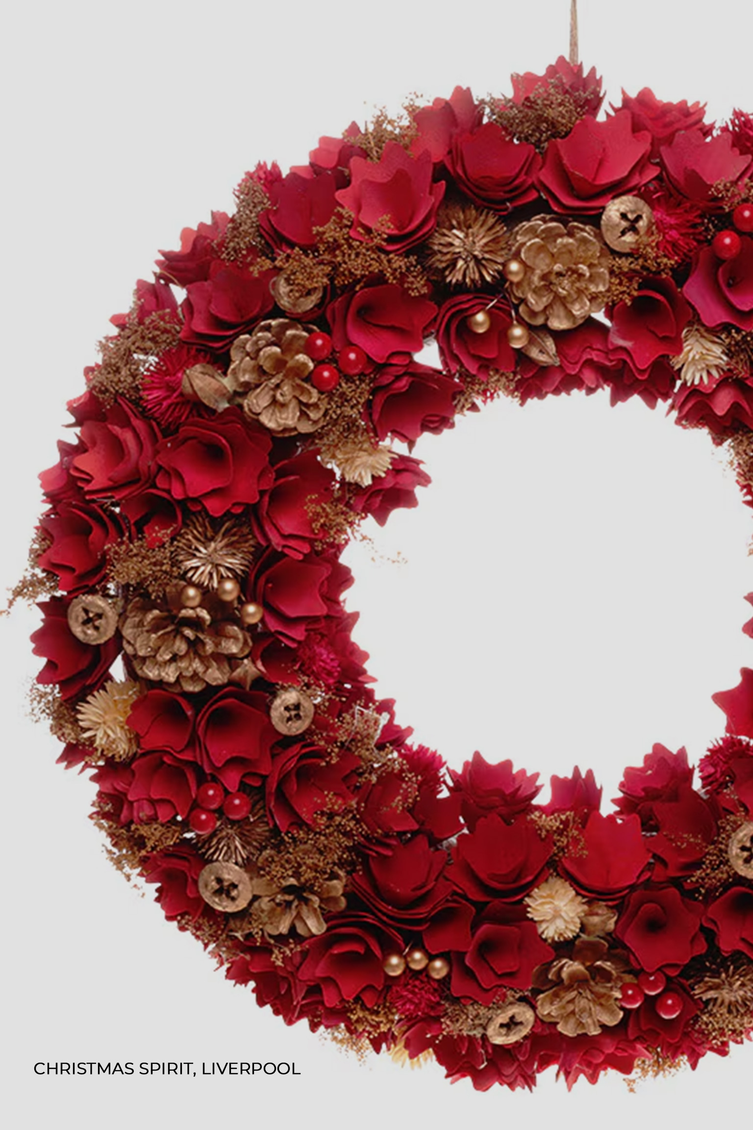 Para tu puerta principal incluye una gran corona como la de Christmas Spirit de Liverpool, de color rojo con piñas y perlas a la que le puedes agregar un moño de tartán en tono dorado o verde para evocar la tendencia desde tu entrada.