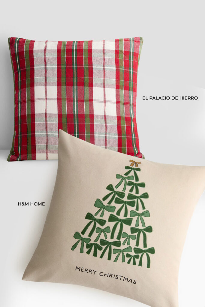 Para el resto del hogar, esta tendencia tiene guiños muy característicos y uno de ellos es el tartán, el cual puedes agregar en tu sala con diferentes cojines decorativos como el diseño de El Palacio de Hierro, así como cojines con clásicos mensajes navideños. Puedes elegir un diseño más sobrio que haga balance con los estampados como el de H&M Home.
