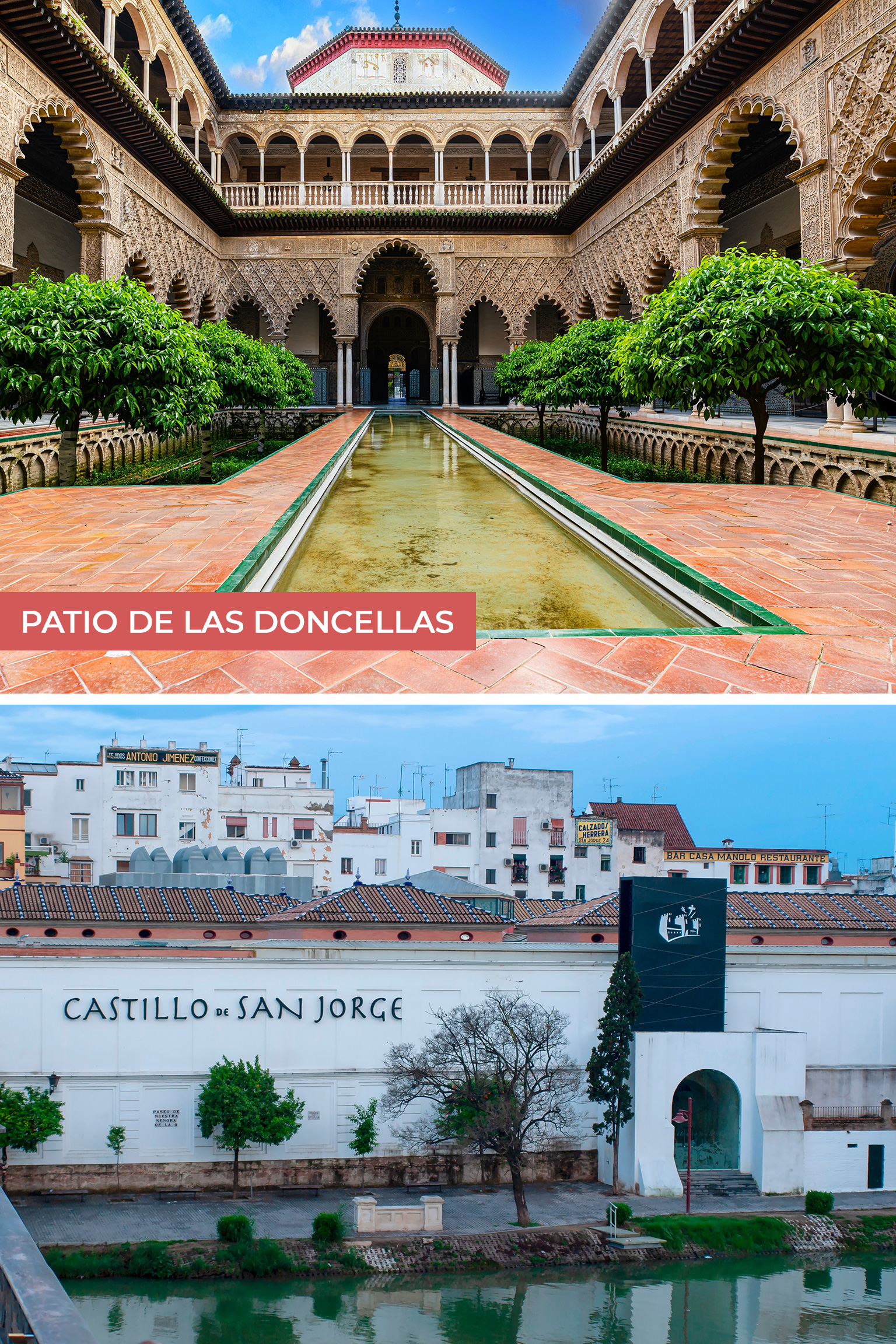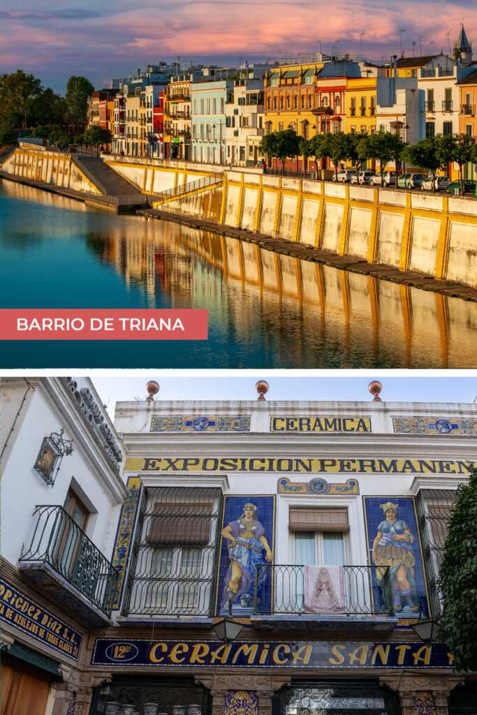 Si quieres sumergirte más en la historia y el arte de Sevilla, entonces dirígete hacia el Barrio de Triana, un distrito que es conocido por su fuerte identidad marinera y flamenca. Ubicado junto al río Guadalquivir. Este barrio tiene mucho que ofrecer y te fascinará por su encanto especial. Visita el Mercado de Triana, donde puedes disfrutar de la auténtica gastronomía sevillana, artesanías, espectáculos de flamenco y tomar clases de cocina; el Castillo de San Jorge, que fue construido sobre una antigua fortificación y que ahora cuenta con una exposición de la Inquisición; el Centro Cerámica de Triana, que alberga una antigua colección de cerámica; y la Calle Betis, que se caracteriza por las coloridas fachadas, además de que es una de las más emblemáticas de Sevilla. Si buscas el spot ideal para una sesión de fotos envidiable, camina hacia el Puente de Triana, el cual ofrece una icónica y hermosa vista del río y de la ciudad.