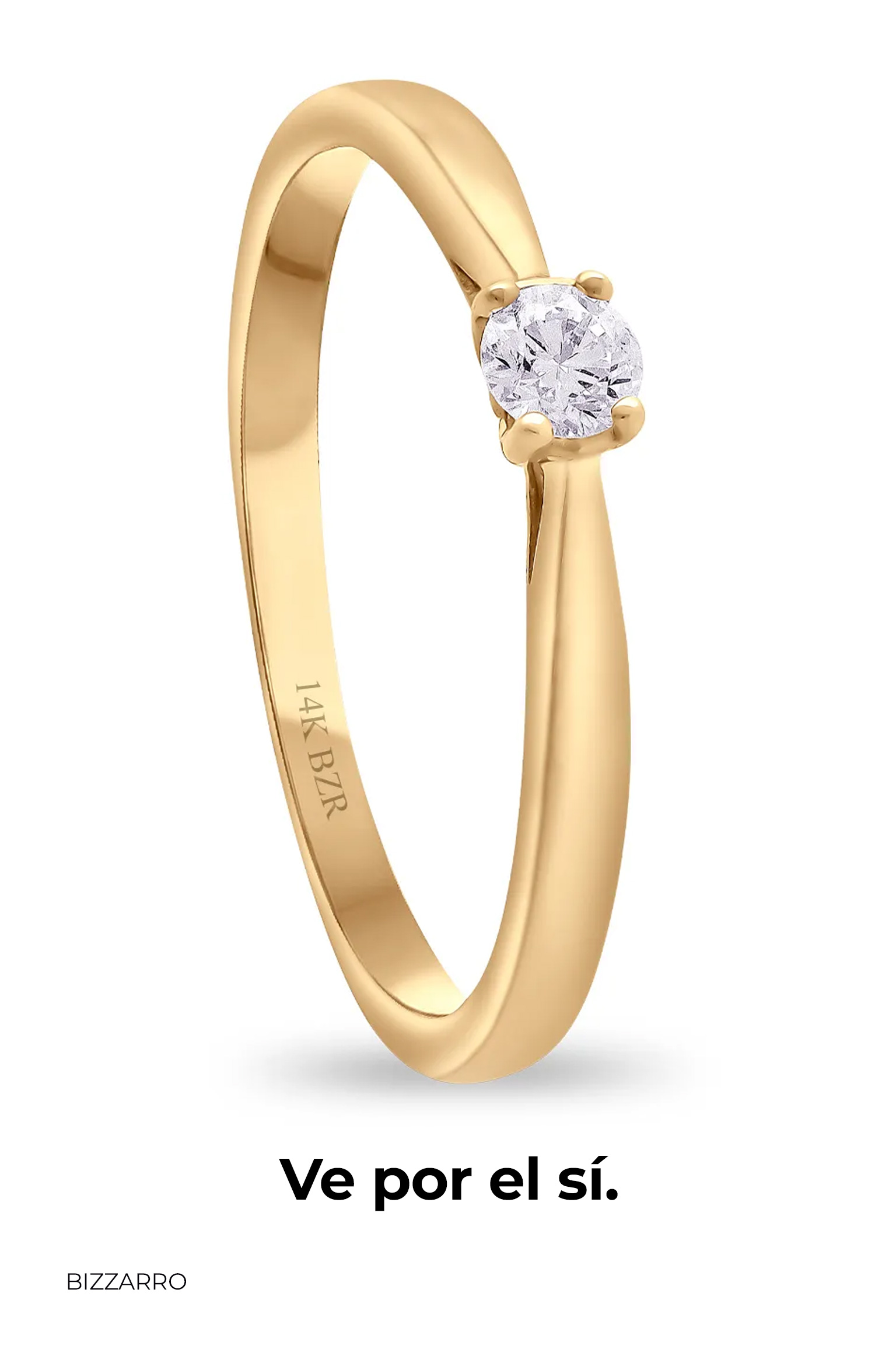 Si ya estás más que seguro de que es el momento de dar paso al compromiso, entonces dale la gran sorpresa a tu pareja con el anillo de compromiso de oro amarillo con diamante de 25 pts de Bizzarro. Este diseño está pensando para rendir tributo al amor con su estética refinada y limpia para darle toda la atención al diamante. Es la pieza perfecta para sellar el compromiso con el amor de tu vida.